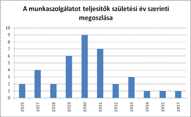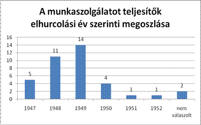 A fentiekben már szóltunk a vizsgált téma kutatásának hiányos voltáról az azonban ismeretes, hogy az első csoportokat 1947 tavaszán indították útnak és a munkaszolgálatnak ez a formája 1952-ig tartott, amikor is újra katonai sorszolgálat teljesítésére kötelezték őket. Mindezeket az adatokat támasztják alá a jelen kutatás folyamán napvilágra került adatok is. (2. ábra)