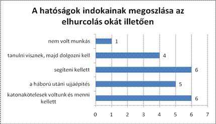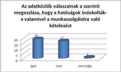 A munkaszolgálatot teljesítők többsége – számszerűen 19-en, akik azt a választ adták, hogy a hatóságok szolgáltak valamilyenféle magyarázattal – kérdésünkre elmondták, hogy a leggyakoribb magyarázat a katonakötelességükre való hivatkozás volt, vagy egyszerűen csak annyit mondtak, hogy „segíteni kell”. Mások esetében kihangsúlyozták, hogy a háború utáni újjáépítés miatt van szükség a munkaszolgálat teljesítésére, illetve előszeretettel illették ezt az intézkedést a „tanulási lehetőség” kifejezéssel. (7. ábra)