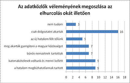 Ami az elhurcolás okát illeti, a hatóságok indoklása vagy éppen nem indoklása mellett megkérdeztük a Donbászt megjárt embereket, hogy ő szerintük miért kellett több hónapot, évet letölteniük a Donyec-medence szénbányáiban. Ennél a kérdésnél az adatközlők több választ is megjelölhettek. (8. ábra)