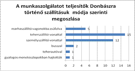 A különböző településeken történő toborzás folyamán az embereket a legtöbb esetben a járási központokban gyűjtötték össze, majd fegyveres őrök kíséretében szállították őket Donbászra teher- vagy személyszállító vonattal, marhaszállító vagonokba zsúfolva, vagy más egyéb módon. (9. ábra)