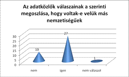 A munkacsoportok nemzetiségi összetételét illetően az eseményeket átélő személyek közül tízen állítják azt, hogy az adott bányában csak magyarok dolgoztak. A megkérdezettek többsége (27 személy) elmondása alapján a munkatáborokban a birodalomban élő nemzetiségek nagy részének képviselőit fel lehetett lelni. Leggyakrabban az alábbi nemzetiségek említése fordul elő: ukránok, oroszok, ruszinok, moldovánok, beloruszok, németek, szerbek, üzbégek, észtek gruzinok, lengyelek, lettek. (10 ábra)
