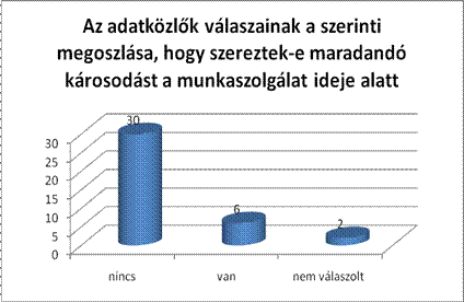 Kíváncsiak voltunk arra, hogy a több hónapi, vagy évig tartó bányamunka okozott e valamilyen maradandó károsodást az adatközlők egészségi állapotában és közülük hatan igenlő választ adtak. (18. ábra) Ők a következő károsodásokat sorolták fel: „a fogaim megsínylették, kihullottak”, „a tüdőm tele van szénporral”, „csontkikopás”, „fáj a lábam”, „sérv”.