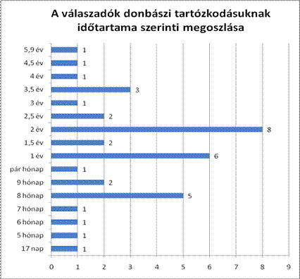 Az adatközlők változó időtartamot töltöttek Donbászon: van, aki közel hat évet dolgozott le a szénbányákban, de olyan visszaemlékezővel is találkozhatunk, akik a sikeres szökéseknek köszönhetően néhány hónap vagy hét után búcsút inthetett a munkaszolgálatnak. (21. ábra)